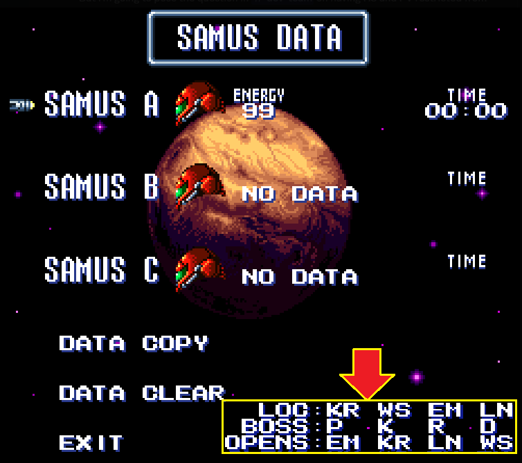 Enabling Bosses Known causes the randomized boss information to be displayed on the file select screen. Players will be shown boss locations (LOC), shown which bosses will be found at those locations (BOSS), and shown which areas each boss unlocks when defeated (OPENS).